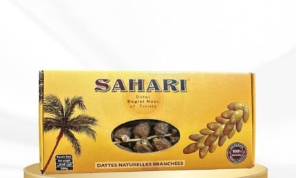 Enjoy the rich, honey-like sweetness of Sahari Deglet Nour Dates, handpicked from the sun-drenched oases of Tunisia. Known as the "Queen of Dates," Deglet Nour is famed for its translucent golden color, soft texture, and perfectly balanced flavor. These dates are presented on the branch, preserving their freshness and natural appeal.