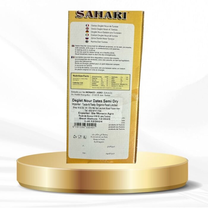 Enjoy the rich, honey-like sweetness of Sahari Deglet Nour Dates, handpicked from the sun-drenched oases of Tunisia. Known as the “Queen of Dates,” Deglet Nour is famed for its translucent golden color, soft texture, and perfectly balanced flavor. These dates are presented on the branch, preserving their freshness and natural appeal.